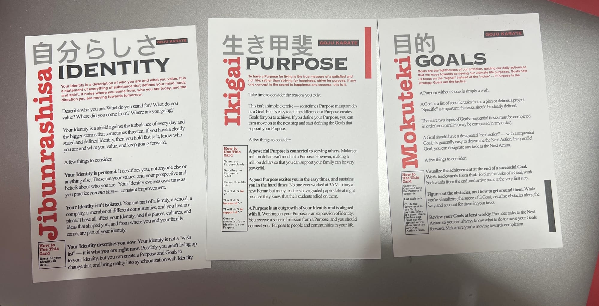 The concept of Goals is a core concept in karatedō and the foundation of other core concepts like jibunrashisa (identity) and ikigai (purpose).